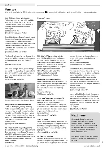 Write to Community Living simonjarrett1@outlook.com f @communityLivingMagazine t @CommLivingMag_ Letters may be edited